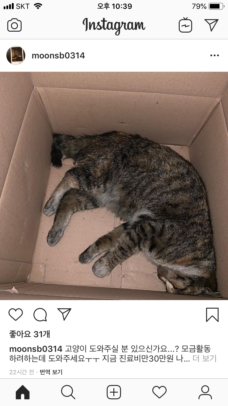 고양이 도와주실분 있으신가요...?모금활동 하려는데 도와주세요ㅠㅠ지금 진료비만 30이상나왔습니다. 이후 진료비100~150정도 나올꺼같아요..관심있으신분 (인스타 아이디:moonsb0314)로 디엠부탁드릴께요! 생명이 살수있는데 죽어가는 모습 보기힘드네요..제발 부탁드립니다!