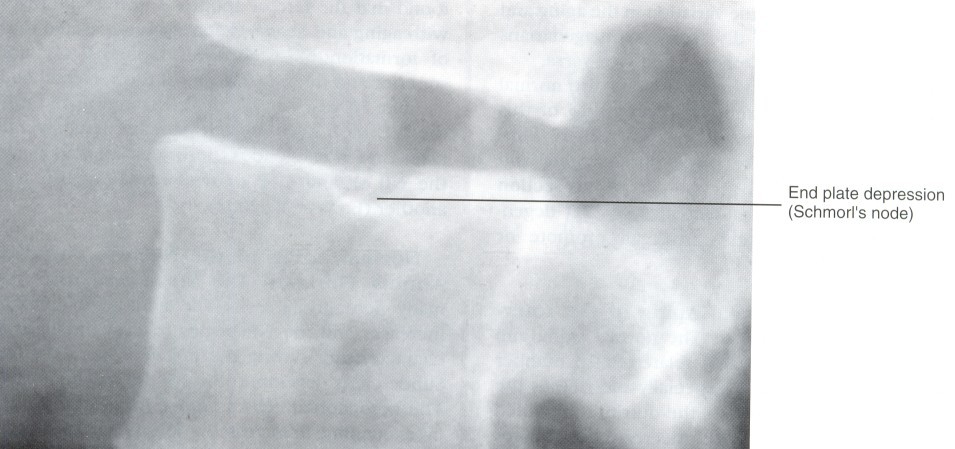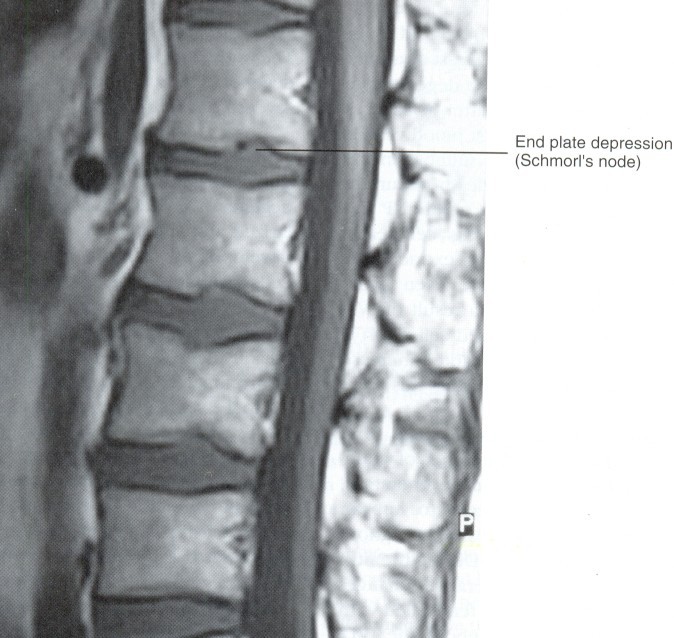 in fact a dorsolumbar kyphosis, seen in adolescents may be associated with Schmorl's nodes. therefore CEP fractures should be considered a possible etiologic cause when an active adolescent patient has back pain of the thoracolumbar region.