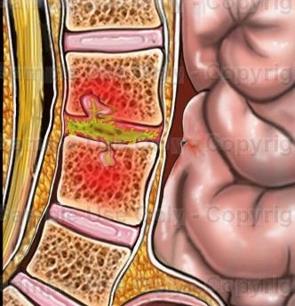 compression injury frequently results in an end plate fracure. this may completely resolve in som epatients, or in others, inflammatory repair processes may extend into the NP and result in disc degradation. such inflammatory disc degradation initiates internal disc disruption, which may become symptomatic, if the AF remains intact, isolated IVD resorption may follow, but if fissures and tears develop in the A, the degraded nuclear material may extrude