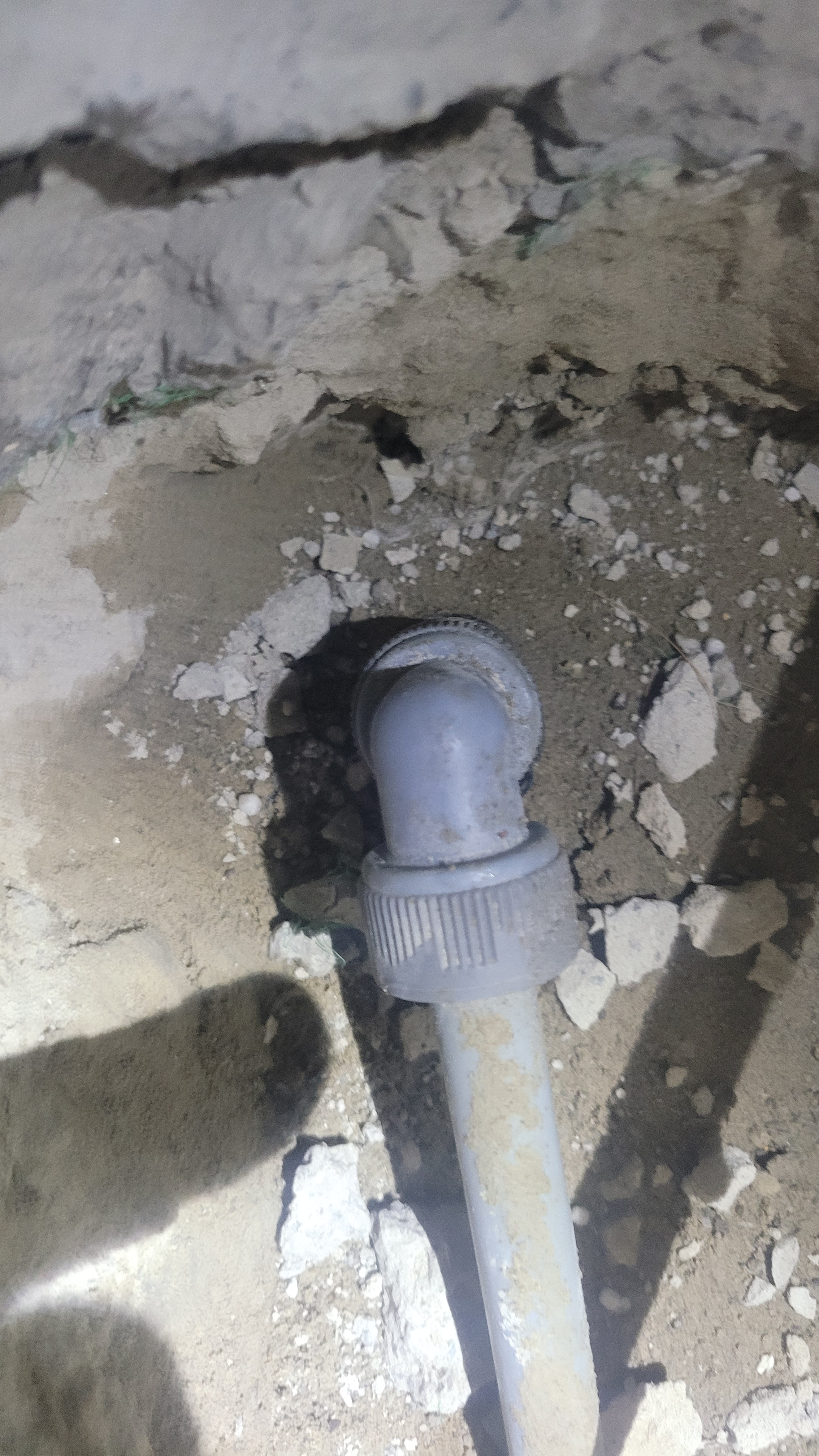 노출된 배관을 보니 아래쪽에서 올라온 배관이 ㄱ자로 휘면서 장력이 생겨 결국 배관이 갈라지게 된것입니다.