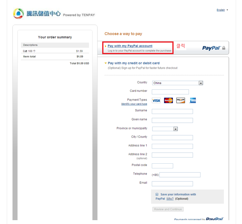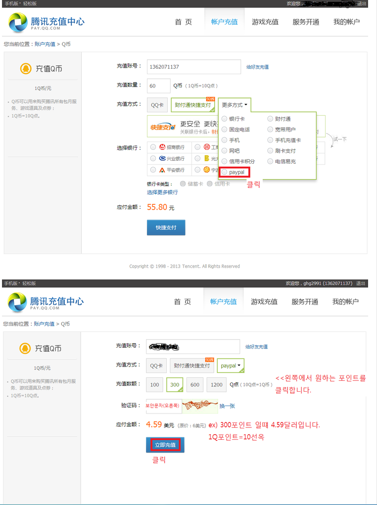 큐큐사이트에 캐쉬를 충전하는 종류에 보면....중국은행 중국핸폰...기타등등 이렇게 있는데요....마지막에 페이팔로도 결재가능합니다.....