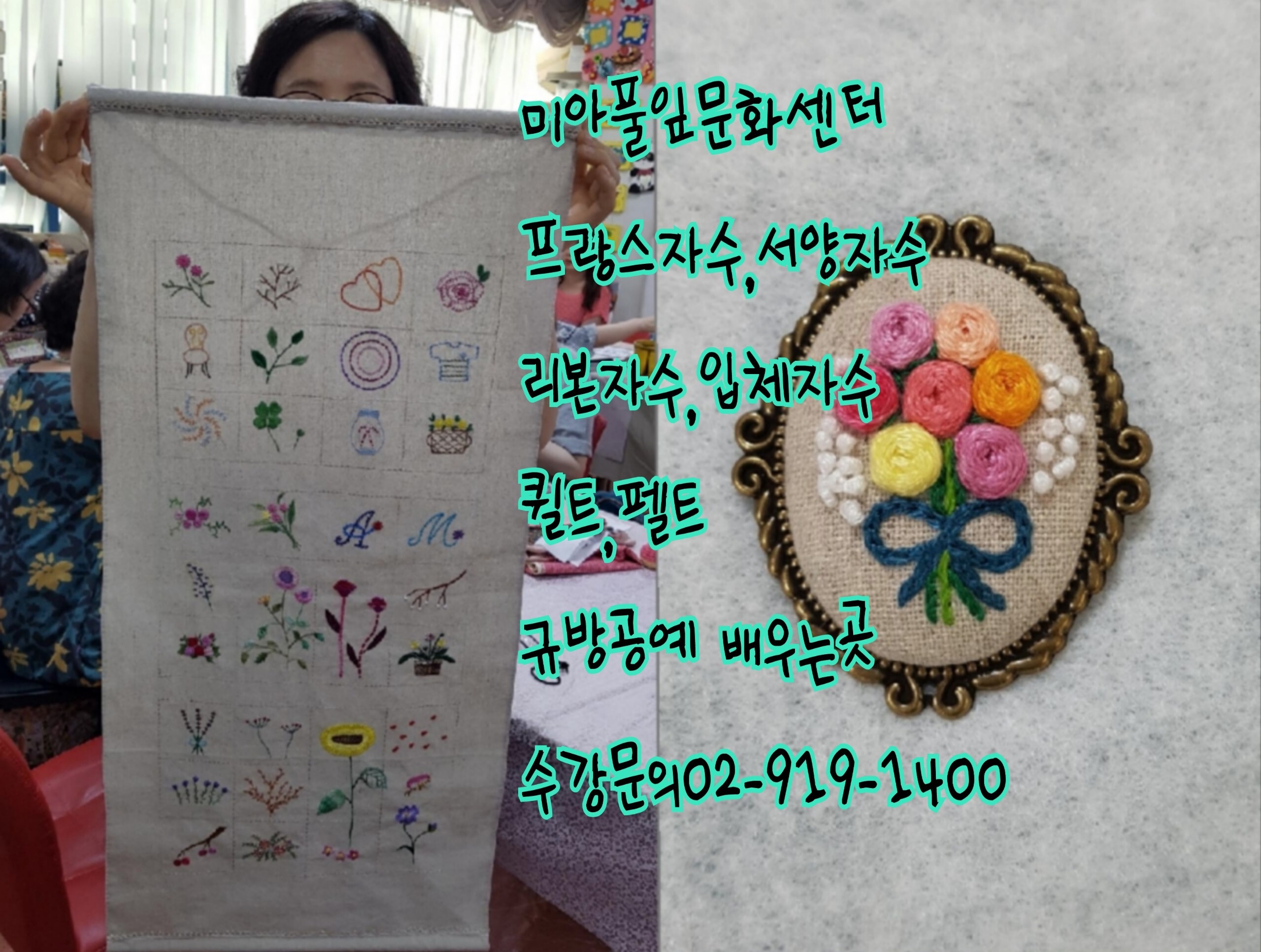 미아풀잎문화센터 수강문의 02-919-1400 서양자수 프랑스자수 펫자수 입체자수 야생화자수 리본자수 퀼트 펠트