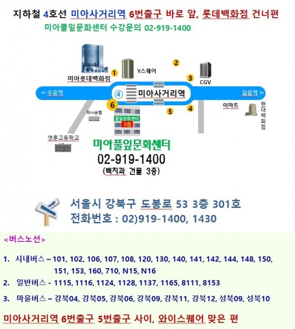 미아사거리역 6번출구 바로 앞에 위치한 행복한 미아풀잎문화센터로 오세요^^