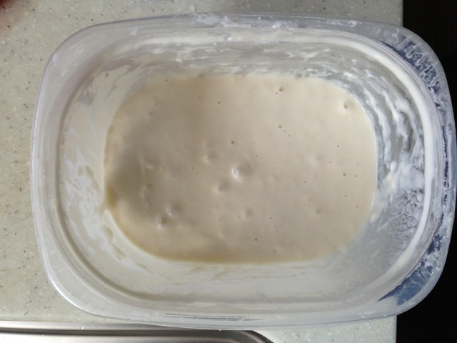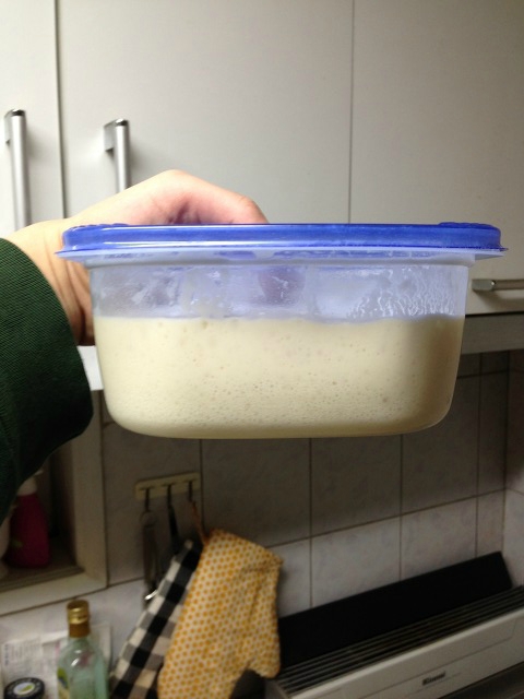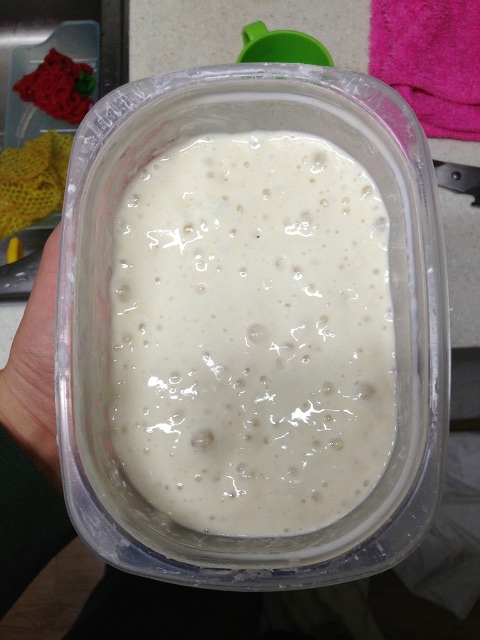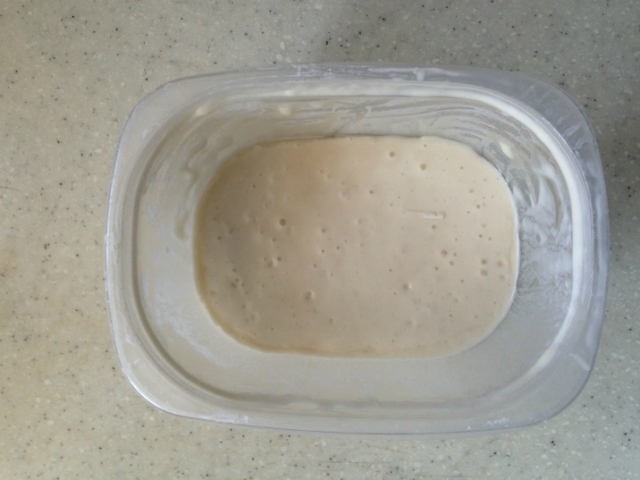 처음에는 저정도 높이였습니다. 용기 뚜껑을 닫고 실온에서 8~12시간 정도 방치 합니다. 부피가 두배정도로 불어나면 베이킹에 바로 투입 할 수 있을 만큼 이스트가 활성화 됩니다.