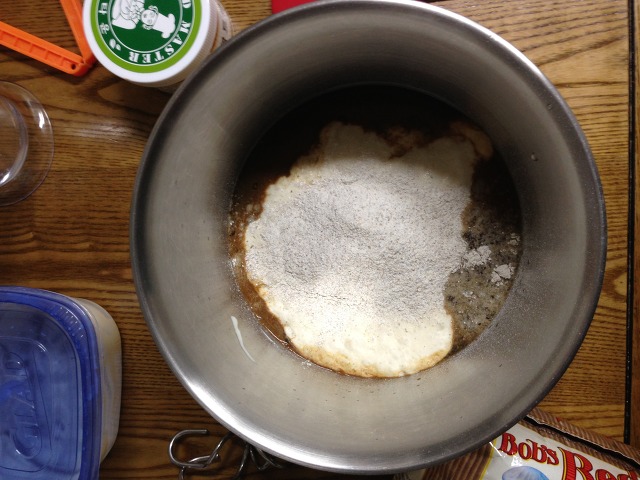 반죽기가 돌아가는 사이에 쓰고남은 발효종에 다시 먹이주기를 해서 다음번에 또 사용할 수 있도록 해 둡니다. 이런식으로 먹이주기를 반복해서 계속 쓸 수 있습니다. 아주 적은 분량만 남아 있어도 먹이주기를 하면 다시 왕성하게 이스트가 번식 한답니다. 잘 섞은 후 실온에서 약 두시간 정도만 방치 한 후 다시 냉장고행입니다. 다음번 빵 굽기 전날 밤에 활성화 해 주면 되겠습니다.