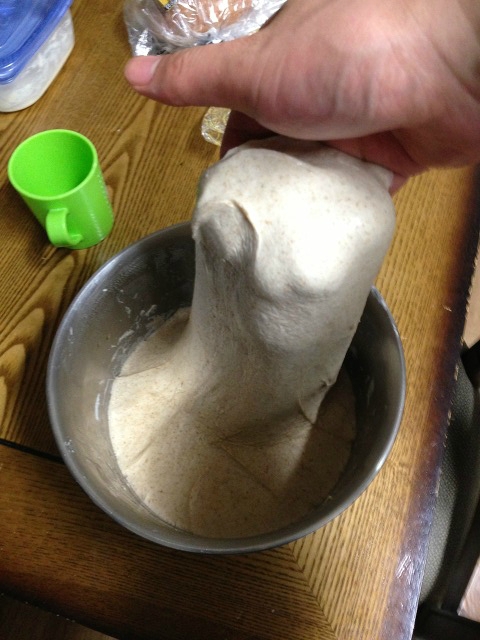 1차 발효는 실온에서 두시간~두시간 반 정도 합니다. 시간은 반죽 발효 상태에 따라 늘리거나 줄입니다. 1차 발효를 하는 도중 위 사진처럼 30분 간격으로 늘여접기(스트렛치 앤 폴드)를 2~3회 정도 해 줍니다. 늘여접기는 반죽을 손으로 잡아당겨서 맞은편으로 접어주는 과정으로 (네방향으로 모두 합니다) 글루텐 형성 및 이스트의 활성화를 도와준다고 합니다. 식빵류는 1차 발효중에 저렇게 험악하게(?) 건드려주면 안되는데 발효종 빵은 저런 과정이 꼭 필요하다고 하네요. 재미있으면서도 귀찮은 과정이기도 합니다.^^