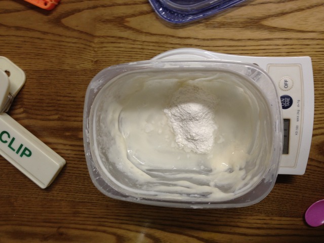 물과 밀가루를 넣어주고 잘 섞어줍니다. 물과 밀과루의 양은 동량으로 해줍니다. 저의 경우 발효종 150그램을 쓸거라서 물 70, 밀가루(강력분) 70그램 넣어줍니다. (원래 있었던 발효종은 약 30그램 정도로 추정)