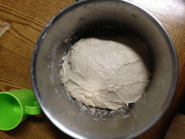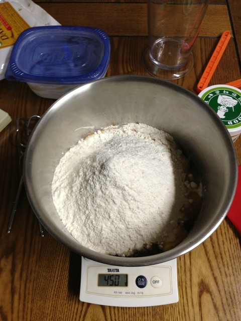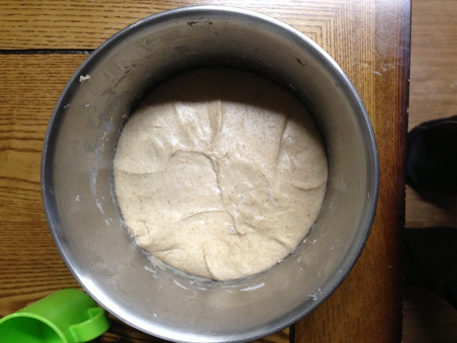 약 10시간이 경과한 후의 모습입니다. 부피가 많이 늘어났지요? 조금 과하게 부풀어 오른 것 같네요. ㅡㅡ; 이스트가 기운 빠지기 전에 얼른 투입하기로 합니다.