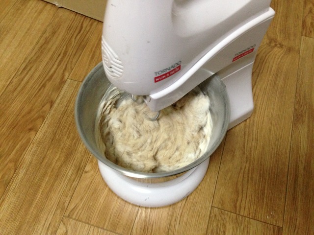 그런다음 일단 흰가루가 보이지 않을정도로 살짝 섞어만줍니다. (허접한 제 반죽기.. 가 보이시나요? ㅡㅡ;; 약 7년전에 몇만원 주고 산 핸드 믹서 겸용 반죽기입니다.. 키친에이드 같은게 있으면 더욱 좋겠지만 이정도만 있어도 빵이 되기는 합니다. ㅎㅎ)