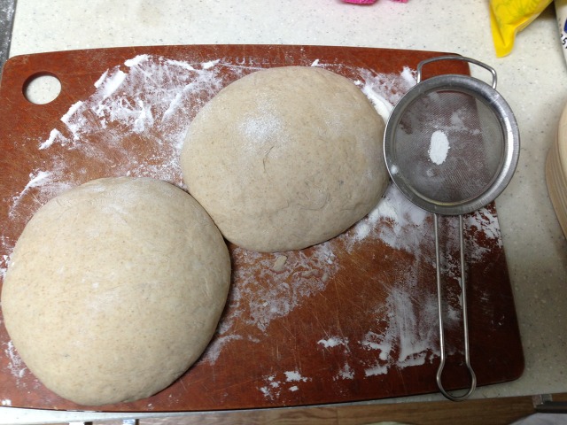 1차 발효가 끝난 반죽을 꺼내서 분할 한 후 벤치타임을 갖습니다. 약 30분.. 반죽이 매우 질기때문에 덧밀가루를 충분히 뿌려가며 작업해야 맨붕을 방지 할 수 있습니다. 두개의 반느통에 넣을 것이라 두개로 분할 했습니다.