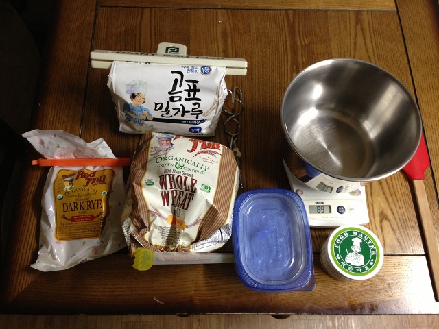 재료와 도구들입니다. 이번에는 가루류를 총 450그램 투입할 예정인데 호밀 50, 통밀가루 100, 강력분 300그램으로 하기로 합니다. 호밀은 맛과 향을 더해주고, 통밀은 백밀가루에는 빠진 영양분 보충 및 거친 식감을 위해 넣습니다. 그냥 밀가루만 사용해도 무방합니다. 파란 뚜껑에 들어있는 것이 발효종, 그옆 녹색통에 들어있는 것이 몰트파우더입니다. 몰트파우더는 쓰지 않아도 무방하지만 넣어주면 밀가루 전분의 당화를 도와서 발효가 더 잘되고 크러스트의 색깔을 더욱 짙게 내 주는 역할을 한답니다. (당분의 카라멜라이제이션으로 인해). 위의 사진에는 빠졌지만 소금도 8그램 정도 넣어줍니다. 유지류나 설탕, 계란 1그램도 한들어가는 순 식물성 건강 레시피가 되겠습니다. ^^