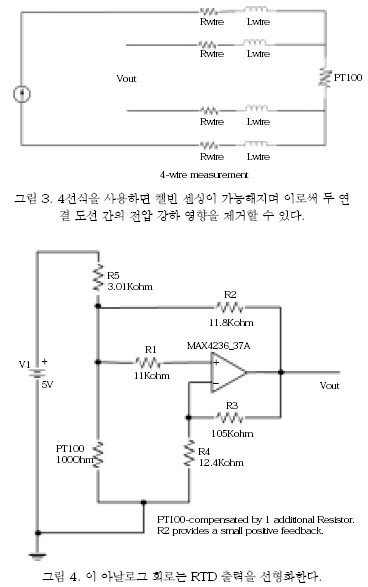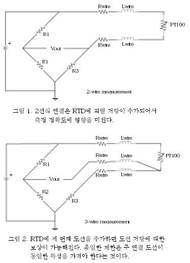 PT100 RTD는 2선식, 3선식 또는 4선식을 사용하여 측정 애플리케이션에 연결할 수 있다(그림 1, 2, 3).