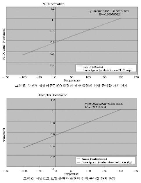 그림 5에는 보정하지 않은 PT100 출력과 y=ax+b 형태의 선형적 근사값 간의 관계, 그리고 그림 6에는 회로의 선형화된 버전과 선형 근사값 간의 관계가 나와 있다.