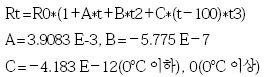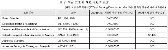 저항 온도 검출기(RTD)는 높은 정밀도를 제공하며 동작 온도 범위는 -200°C~850°C이고 전기적 출력의 전송, 전 환, 표시, 기록 및 처리가 적절한 데이터 처리 장치를 사용하 여 쉽게 가능한 편이다. RTD 저항은 온도에 비례하므로 저 항을 통해 알려진 값의 전류가 흐르면 온도에 따라 증가하는 출력 전압이 생성된다. 저항과 온도 간의 정확한 관계를 알면 주어진 온도의 계산이 가능하다. 어떤 소재에 있어 전기적 저항의 온도 변화를 해당 소재의 ‘저항 온도 계수’라고 한다. 대부분 금속의 온도 계수는 양수 이며 대부분의 순수한 금속에서는 사용 가능한 온도 범위의 대부분에서 기본적으로 상수값을 갖는다. 또한 저항 온도계 는 온도 측정에 있어 가장 안정적이고 정확하며 선형적인 장 치이다. RTD에 사용되는 금속(백금, 구리, 니켈)의 고유 저 항은 필요한 온도 측정의 범위에 따라 달라진다. 백금 RTD의 공칭 저항은 0°C에서 100Ω이다. 백금 RTD 의 경우 표준화가 많이 진행되어 있기는 하지만 세계적으로 통일되지 않은 다수의 표준을 따르고 있다. 따라서 하나의 표 준에 맞춰 만들어진 RTD를 다른 표준에 맞춰 설계된 기기에 사용할 때는 문제가 발생한다. 백금은 장기 안정성, 반복성, 빠른 응답 속도 및 넓은 온도 범위 등으로 인해 여러 애플리케이션에서 유용하게 사용된 다. 따라서 백금 RTD는 온도 측정에 있어 가장 신뢰도 있는 표준으로 인식되어 있다. PT100 RTD는 다음 공식으로 나타 낼 수 있는데 온도와 저항은 당연히 비선형적인 관계이다.
