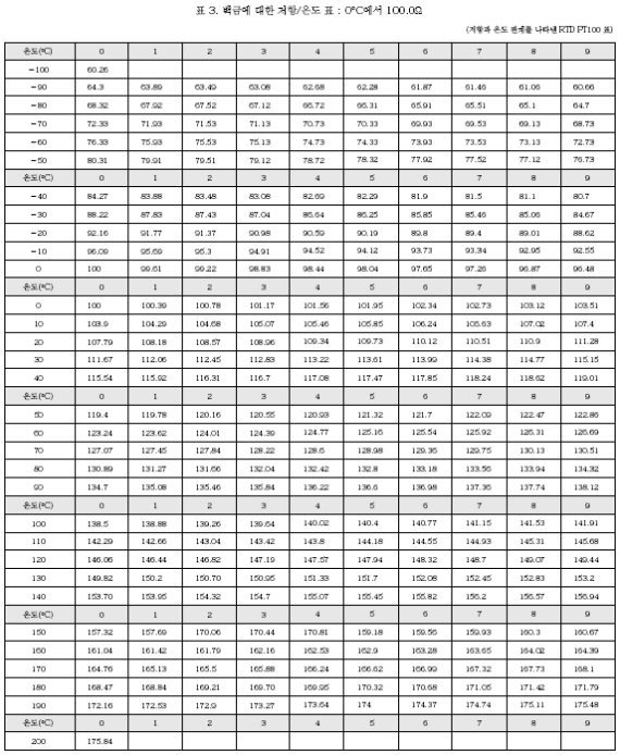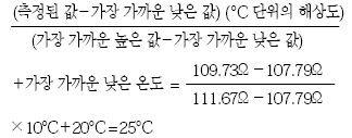 PT100 RTD의 비선형성을 보상하는 방법으로는 몇 가지의 아날로그 및 디지털 방식을 사용할 수 있다. 예를 들어 디지털 선형화는 대조표를 사용하여 구현하거나 위의 일반식을 사용하여 구현 할 수 있다. 마이크로프로세서 메모리에 있는 대조표를 사용하면(보간 법 사용) PT100의 저항 측정값을 해당하는 선형화된 온도 값으로 변환할 수 있다. 반면 위의 식을 사용할 경우 실질적 으로 측정된 RTD 저항값으로부터 온도값을 직접 계산할 수 있다. 대조표의 경우 필요한 정확도와 사용 가능한 메모리의 양 에 따라 제한된 수의 저항/온도 값이 필수적으로 포함된다. 구체적인 실제 온도 계산을 위해서는 먼저 두 가지의 가장 가 까운 저항값(측정된 RTD 값의 위와 아래에 있는 값)을 찾은 후 이 두 값 사이에서 보간을 수행하게 된다. 예를 들어 측정된 저항의 값이 109.73°C인 경우, 대조표의 해상도가 10°C라면 두 개의 가장 가까운 값은 107.79Ω(20°C) 과 111.67Ω(30°C)이 된다. 이 세 개 값으로 보간법을 쓰면 다음과 같다.