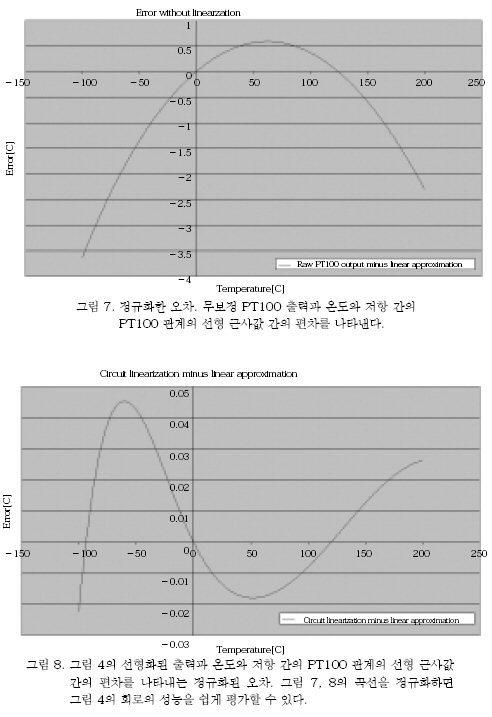각 그림에는 그림 4의 회로로부터 계산된 출력과 비교한 온도와 저항 사이에서 계산된 관계가 나와 있다. 그림 7 및 그림 8의 그래프를 보면 아날로그 보정 전과 후의 PT100 오차를 알 수 있다.