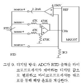 디지털 방식(그림 9)의 예제 회로에는 RTD, 차동 증폭기, 전류원 및 마이크로프로세서에 의해 제어되는 A/D컨버터(그림에는 나와 있지 않음)가 포함된다.