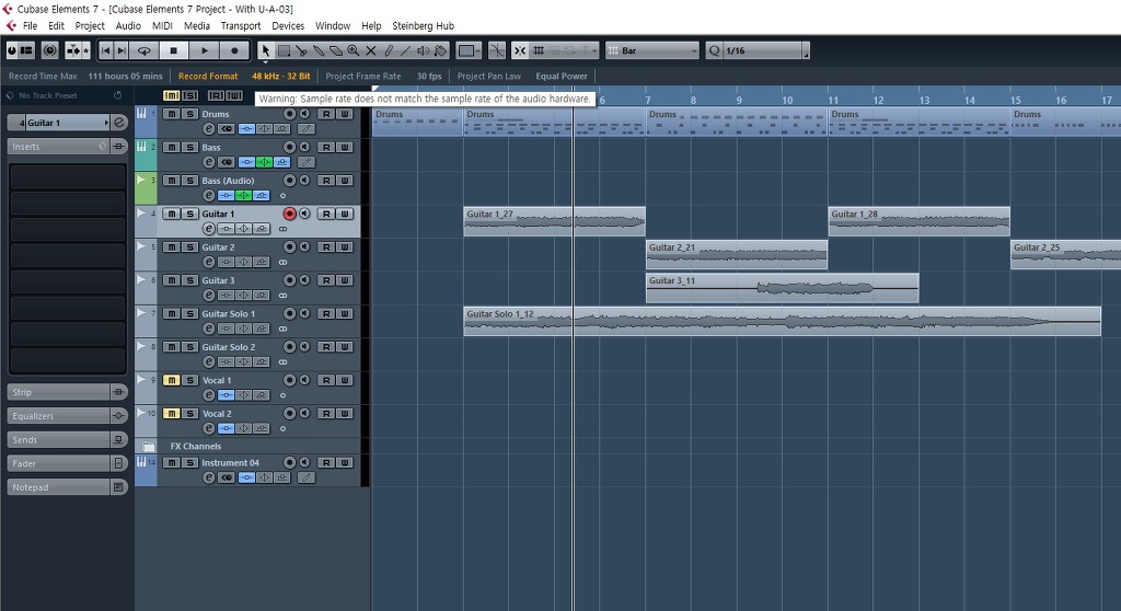 재생시 샘플레이트가 문제가 있는지 보이는 화면에는 노란색으로 떠서(상기 화면), Project Set Up 에 가서 샘플레이트를 48kHz, 32Bit Float로 다시 설정해주어도 계속 느리게 재생이 됩니다.