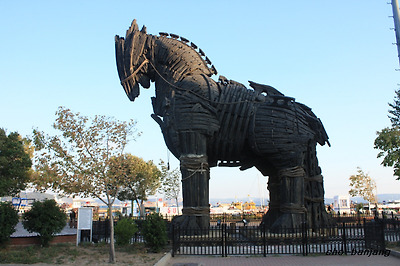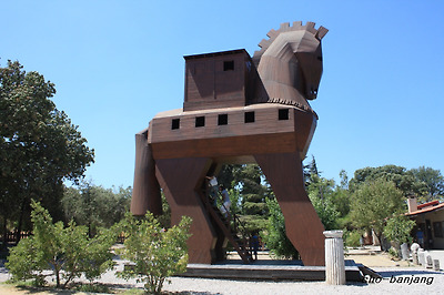 [ 트로이 유적지에는 상징물로 트로이 목마가 설치되어 있으며 많은 인파가 오르고 내린다. ]