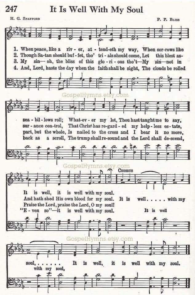 Did you know, the song "It Is Well With My Soul" was written by a successful Christian lawyer Heratio Spafford. His only son died at age 4 in 1871. In 1872, the great Chicago fire wiped out his vast estate, made from a successful legal career.