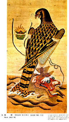 (사진 오른쪽: 해롱신응도. 용맹스런 매가 사악한 바다 용을 짓누르고 있다. 변덕심한 바다에 대한 혐오감의 표현일 것이다. 이렇게 민화라는 이름의 그림은 백성의 소박한 희노애락을 담는다. 그 속에 우리의 원형이 있었다)