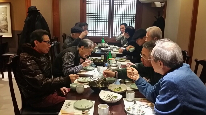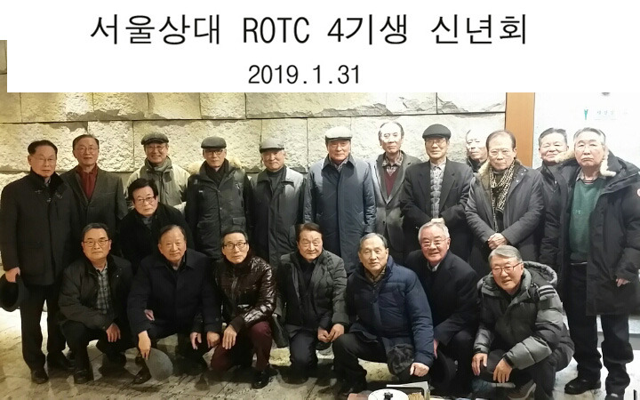 ROTC 신년회 후기 지난 1월31일 12시 상대 ROTC4기 신년회 모임이 교대역 한식당 '서초원'에서 있었다. 상과대학 동기생 중에서도 3,4학년에 군사학을 배우고 30사단에 입소하여 여름방학에 입영훈련을 받았던 동기생 들이라 특별한 우정을 쌓은 친구들이다. 1966년도에 임관을 했으니 올해가 임관 53주년이 되는 해이다. 지난해 손충남 전회장으로 부터 회장직을 물려받아, 임기동안 소원했던 친구들을 "좀더 많이 불러내자"라는 각오로 전화하고 문자 보내며 소통한 결과 최평욱 교관과 19명의 동기생- 모두 20명이 모였다. 참석한 교관님과 동기생들께 깊이 감사를 드린다. 특히 처음으로 얼굴을 보여주신 박성출 동문은 전 동기생들로부터 대 환영을 받았다. 연락과 함께 바로 참가의사를 보인 민수기,임정일 동문도 고맙고. 또 멀리 태국에 거주하던 이상익 동문이 모친상을 당한 어려운 상황에도 친구들 보고싶다며 나와주어 너무나 고마웠다. 늘 개근하던 이인희,김동엽,최성태가 만부득이한 사정으로 빠져서 아쉬웠지만 모두에게 양해를 구했다. 오랫동안 연락을 못했던 동문들께 어렵게 전화를 했을 때 다정하게 대해준 친구들 정말 고맙고 감사했었다. 대전에 있는 김화섭,동탄에 거주하는 박승주,이광우,김정남 등. 최교관의 격려의 말씀과 건배제의로 시작된 모임은 식사가 끝난후 서영교 동문부터 지명제로 화순이 이어졌다. 서영교,민수기,손량,이광현,손충남,이충우,박성출 동문이 현시국과 군시절 에피소드 등 화제를 만들어 환담을 이끌어 주었다. 특히 박성출회원은 동창회,지역모임 등 어느 모임에서도 뵙기 힘들었는데 주로 골프인생으로 즐겁게 살아간다며 김해출신으로서 안타까운 마음을 털어놓았다. 멀리 강태원과 한호 동문에게는 ROTC 회원명단을 보냈었는데 감사하다는 인사와 함께 오늘 찍은 사진과 옛사진을 보태 동영상을 만들어보라는 부탁도 받았다. 내년에는 좀 더 뜻있는 모임을 약속하면서 식당내 입구에서 단체사진을 남겼다. 단체사진에 프랑카드를 포토샾에서 만들어 붙였더니 언제 프랑카드까지 준비했냐는 칭찬도. 내년에도 모두 건강한 모습으로 나와주시길 바라며--서영교 동문의 당부말을 전하면서 끝맺음 인사를 드린다. "3월1일 삼일절 광화문 태극기집회에는 ROTC 전원 구국의 마음으로 집결" 2019년도 신년회 1964년도 30X에서 설연휴가 시작되었습니다. 모두 가족과 함께 즐겁고 행복한 설명절 보내시길 기원합니다. |