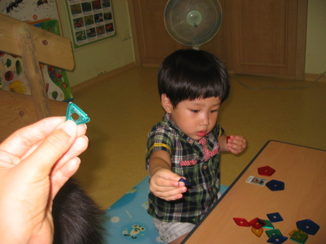 유난히 세모를 좋아하는 인우... 오늘도 역시 교사의 말이 떨어지기가 무섭게 이미 찾아서 양손에 들고 있었던 세모모양 단추를 내밀며 "여기 세모"한다. 나머지 하나는 희주에게 전해 주며 희주야"세모"한다.