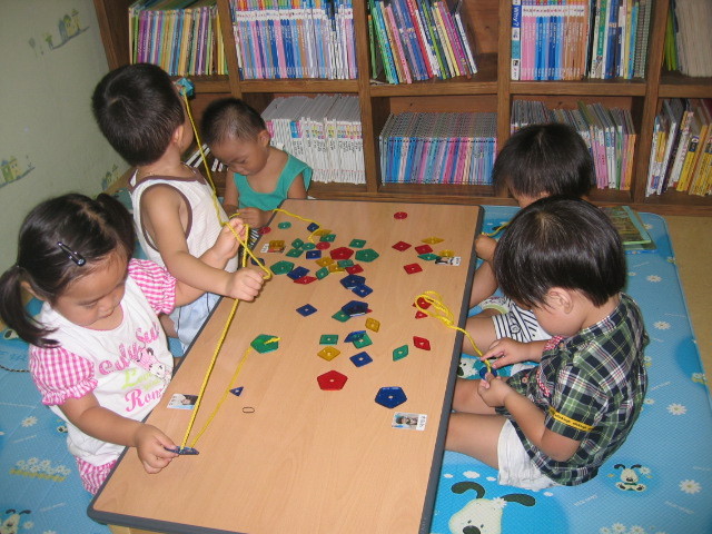 교사가 끈을 찾아서 나눠주자 단추를 꿰기 시작하는 친구들 말 한마디 없이