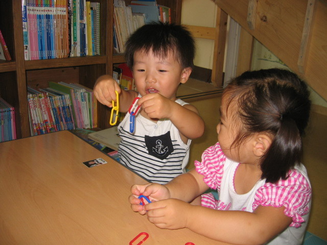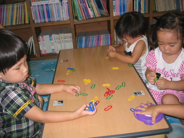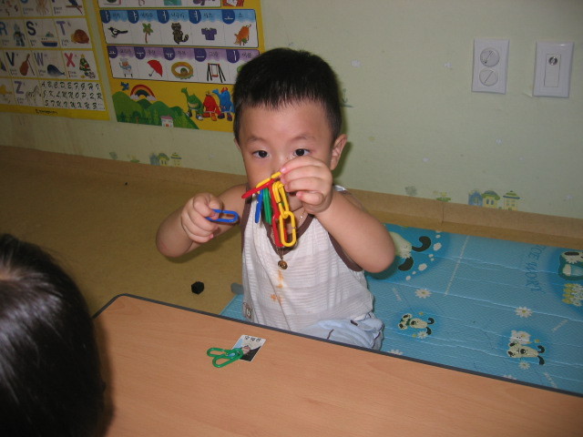혼자서 묵묵히 고리를 끼우던 에준이는 순식간에 20개 남짓을 연결해 교사에게 내밀어 보인다.