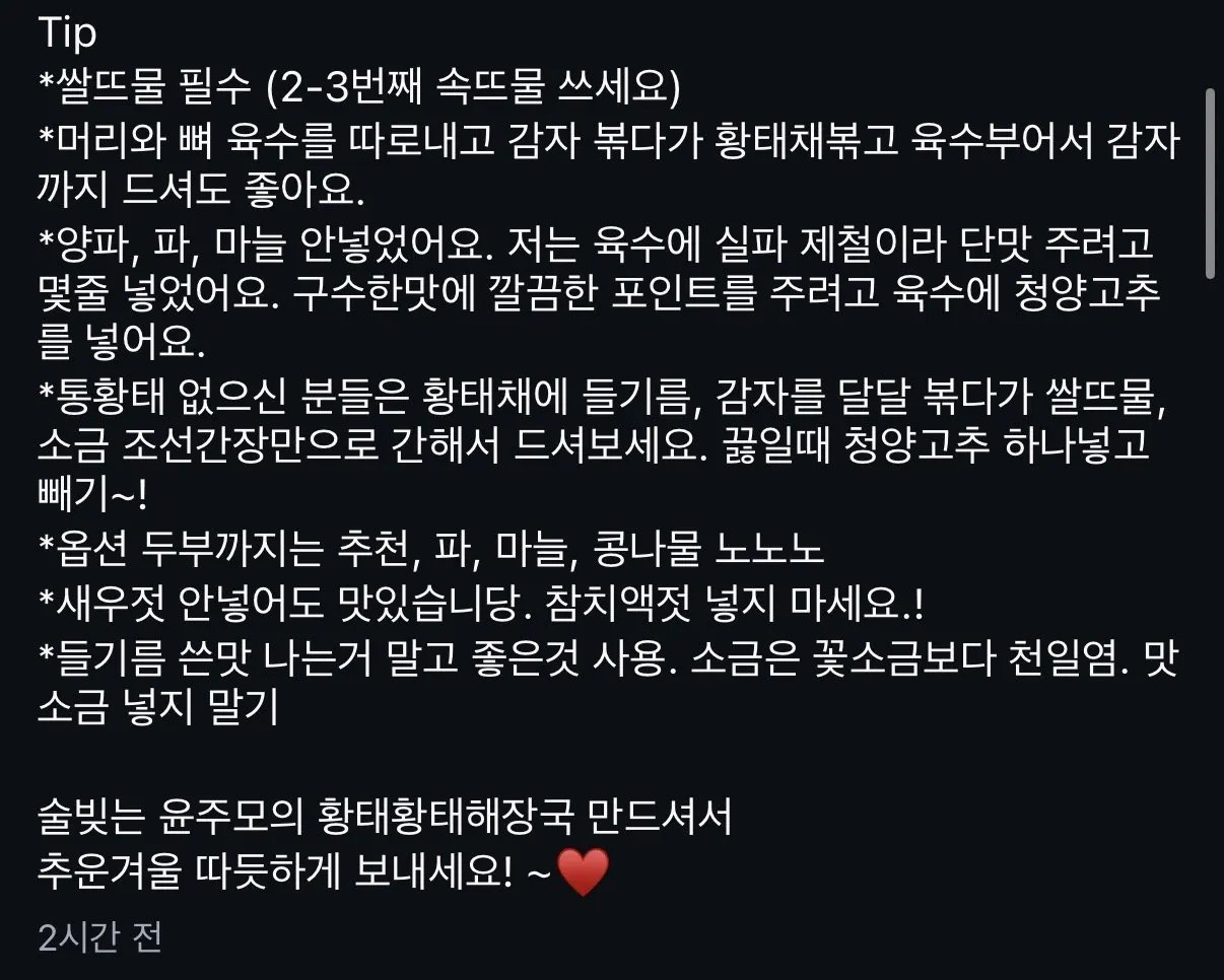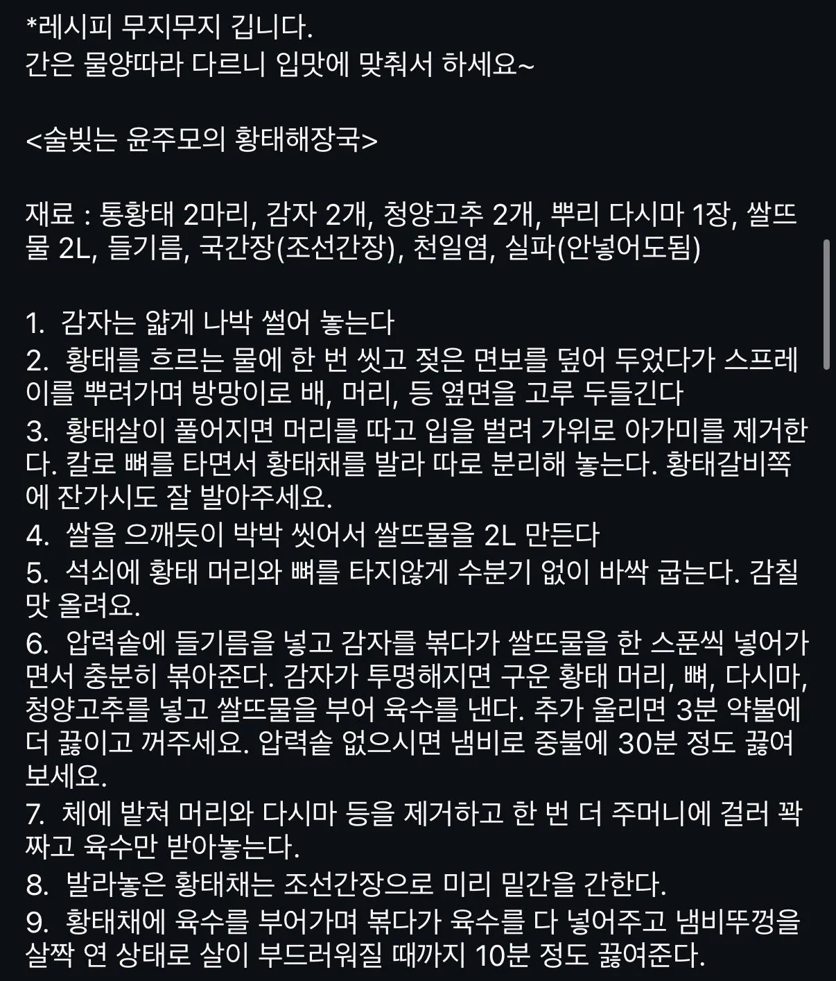 [기타]쿨하게 황태해장국 레시피 올려준 흑백요리사2 윤주모 인스타 작성자NewJeans|작성시간26.01.06|조회수2,905 목록 댓글 5 글자크기 작게가 글자크기 크게가 다음검색 현재 게시글 추가 기능 열기 북마크 공유하기 신고 센터로 신고 댓글 댓글 5 댓글쓰기 답글쓰기 댓글 리스트 작성자페이커 | 작성시간 26.01.06 우와 대박 작성자뉴요커 | 작성시간 26.01.06 알려주셨지만 못하겠다 정성 미쳤다 작성자감딸기 | 작성시간 26.01.06 레시피를 알아도 똑같이 못함... 작성자다흰 | 작성시간 26.01.06 정성 미쳣다 근데 맛있겠잔아 작성자정태주 | 작성시간 26.01.06 좋은 들기름 구하기부터 난관인데 ㅜ 근데 멋있다 레시피 그냥 막 알려주는거 댓글 전체보기