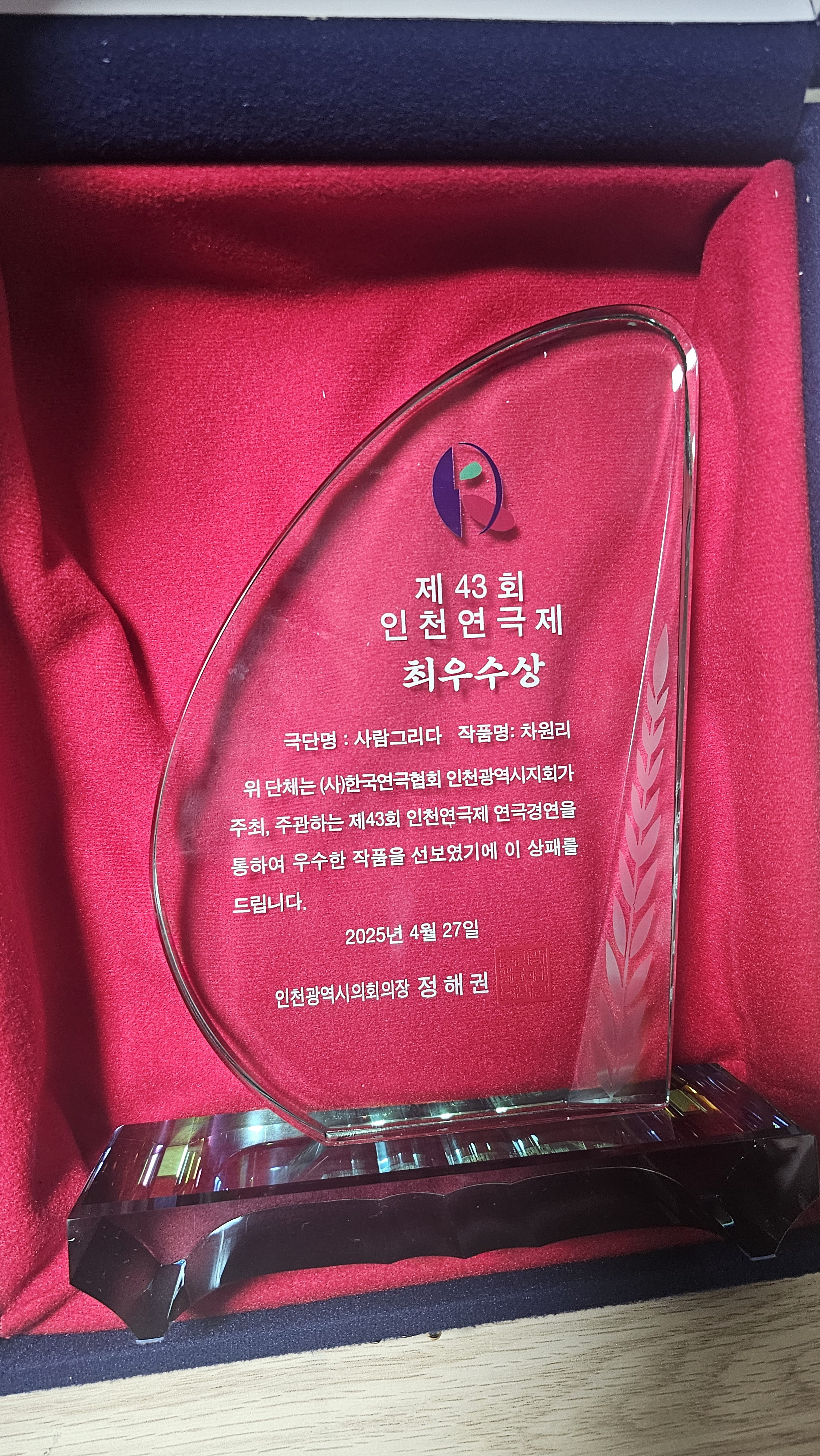 제43회 대한민국연극제 인천지역 예선에서 최우수상과 희곡상 수상