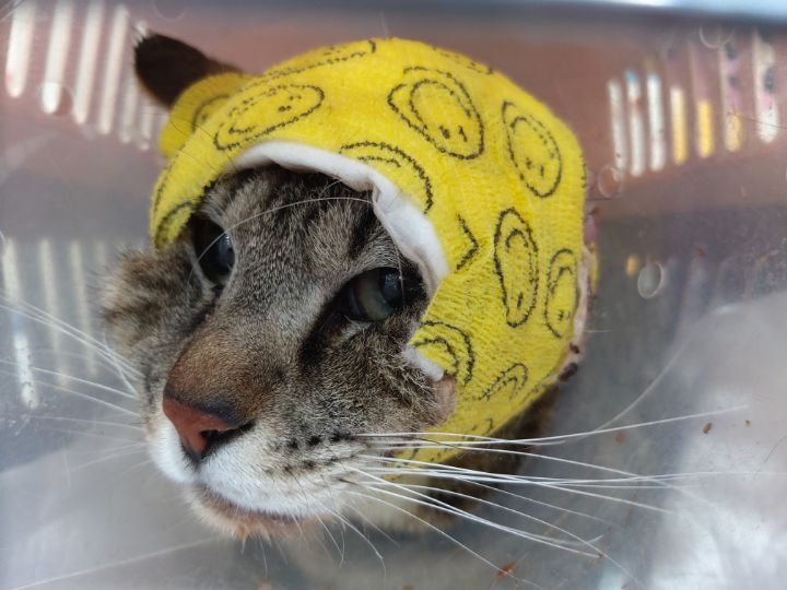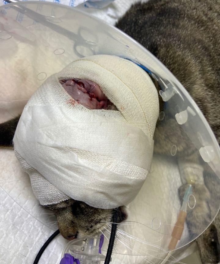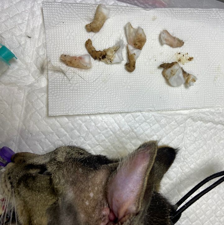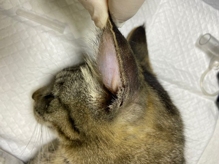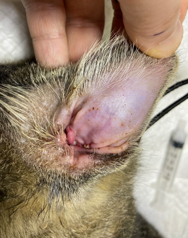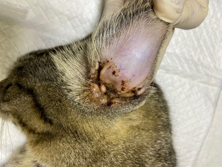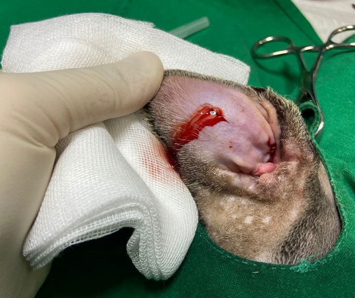 귓속에 염증이 심했던 빠이가 간지럽고 아픈 귀를 발로 긁고 머리를 터는 행동을 반복하면서 귀혈관이 터져 귀가 혈액으로 부풀어오른 상태였습니다