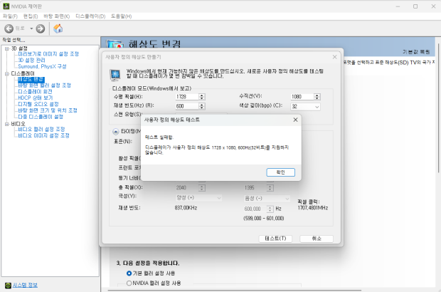 1728x1080을 사용자 지정으로 만들어서 사용할라 하는데 계속 테스트 지원이 불가하다고 뜨네요