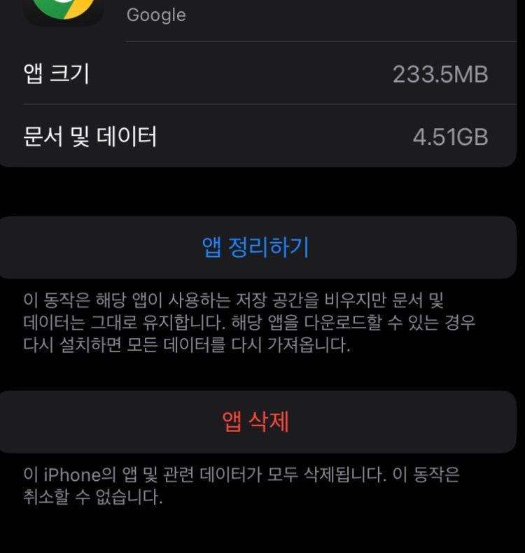 설정 → 일반 → iPhone 저장 공간 → Chrome 선택