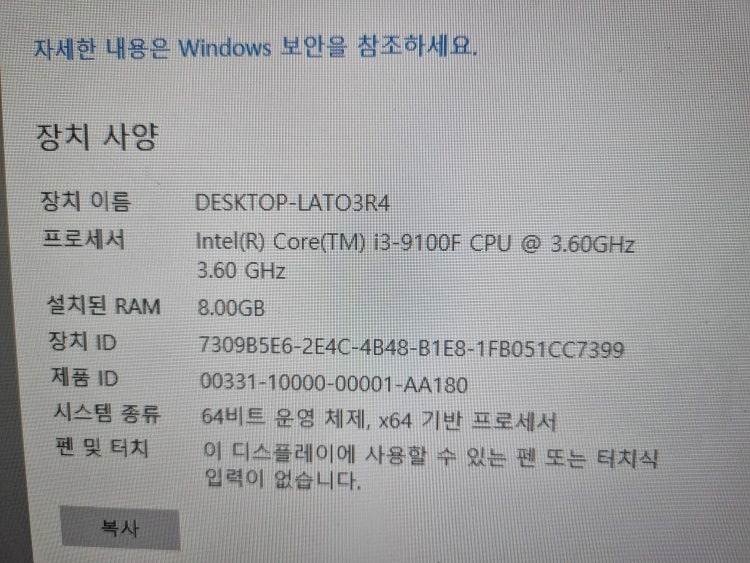 그래픽카드: 사진에선 확인 안 되지만, i3-9100F는 내장 그래픽이 없어요!