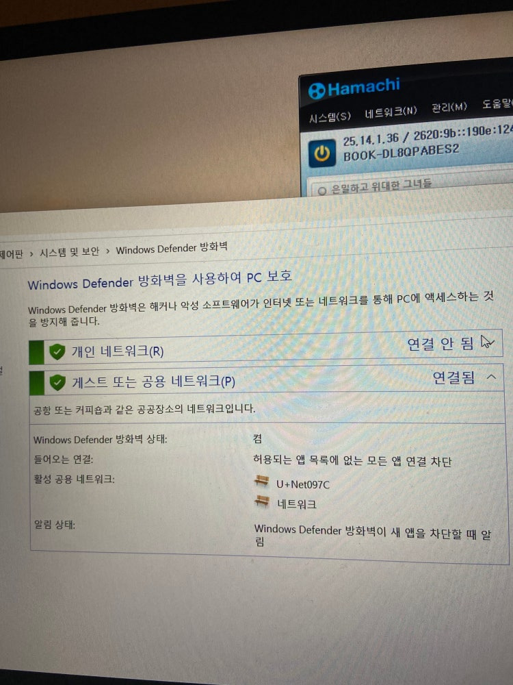 - `Windows Defender 방화벽`에서 "앱 또는 기능을 Windows Defender 방화벽을 통해 허용"을 클릭하고, 마인크래프트와 Hamachi를 찾아 체크하세요.