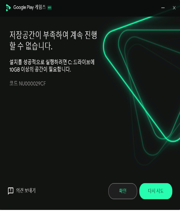 이 오류는 설치 경로 접근 권한 문제 또는 임시폴더(C:\ProgramData\Google\PlayGames)에 접근 불가로 인해 발생할 수 있습니다.
