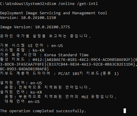 아직 en-US로 되어 있다면, 위 set-allintl 명령어를 다시 실행한 뒤 재부팅하세요.