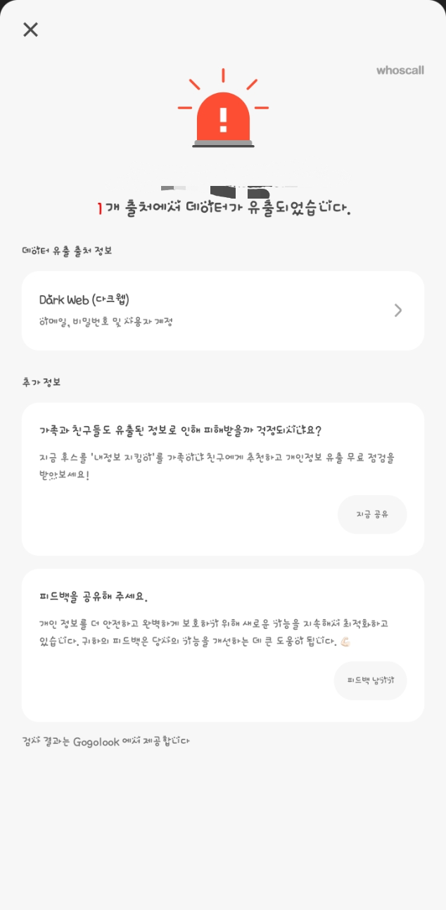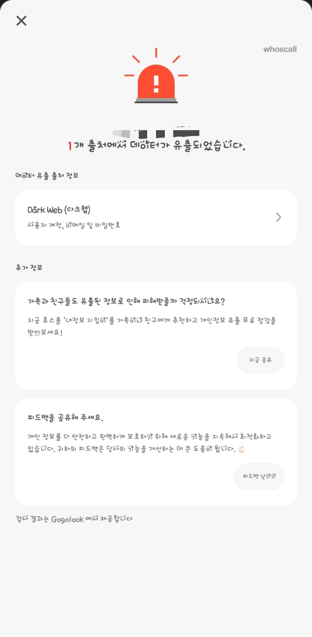 후스콜(Whoscall)은 Gogolook이라는 보안기업이 다크웹을 모니터링하여 유출된 이메일/비밀번호 조합을 탐지한 결과를 알려주는 서비스입니다.