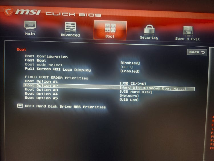 CD/DVD 부팅 필요 없다면, Boot Option #2나 이후로 옮겨도 OK