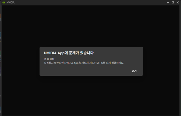 언젠가부터 NVIDIA APP 실행 시 아래와 같은 이미지와 함께 실행이 되지 않고 있습니다.