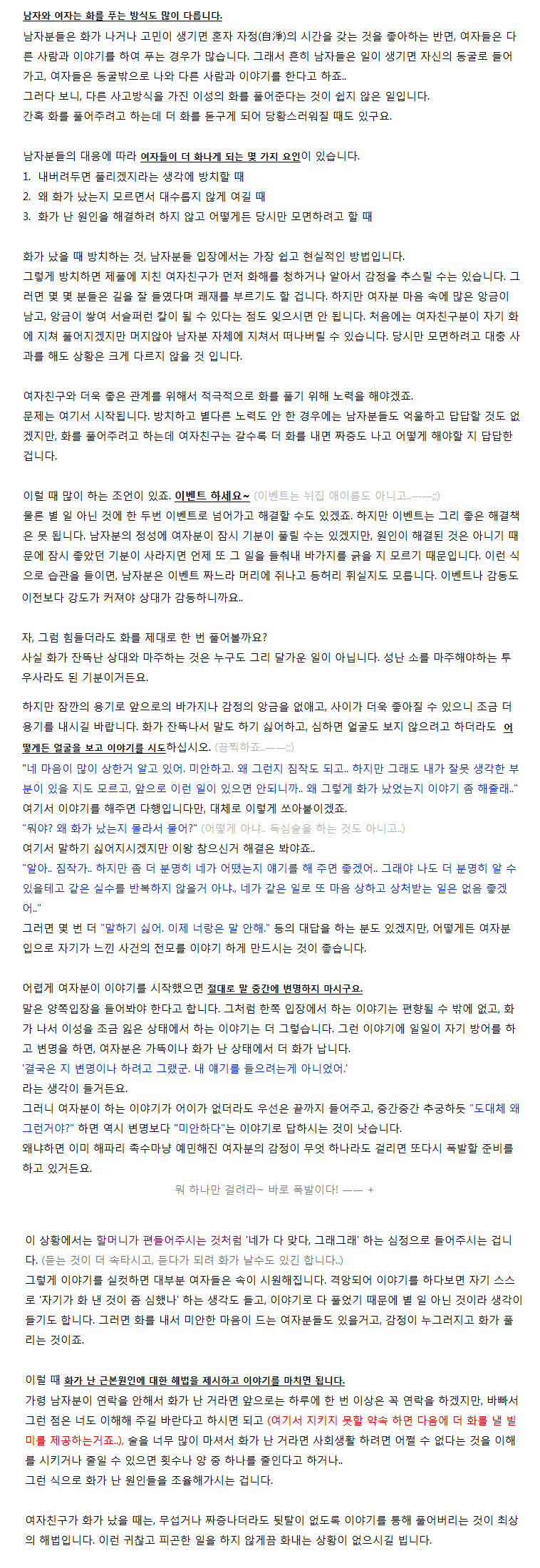 여자친구가 화 났을 때 대처법 작성자마음나무|작성시간12.11.18|조회수328 목록 댓글 2 글자크기 작게가 글자크기 크게가 출처: http://lalawin.com/entry/girlfriend-angry 다음검색 현재 게시글 추가 기능 열기 북마크 공유하기 신고 센터로 신고 댓글 댓글 2 댓글쓰기 답글쓰기 댓글 리스트 작성자난행복한사람이다 | 작성시간 13.06.14 잘 봤습니다. 작성자어리 | 작성시간 14.02.20 앤에게 꼭 보여줘야될 글 댓글 전체보기