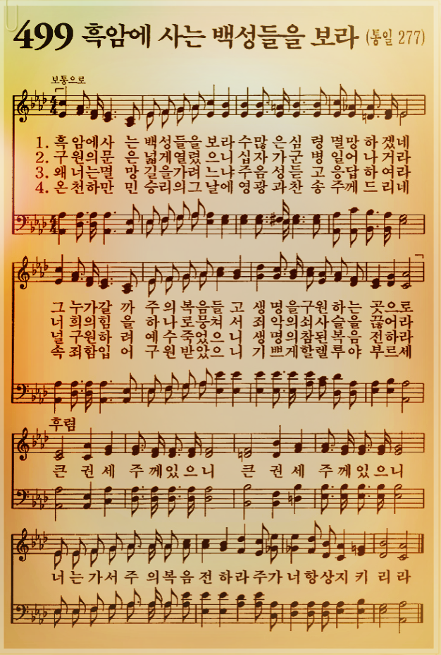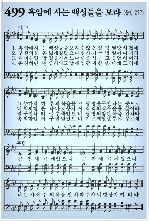 찬송가499장 흑암에 사는 백성들을 보라 작성자미순|작성시간20.05.30|조회수212 목록 댓글 0 글자크기 작게가 글자크기 크게가 . 다음검색 현재 게시글 추가 기능 열기 북마크 공유하기 신고 센터로 신고 댓글 댓글 0 댓글쓰기 답글쓰기 댓글 리스트