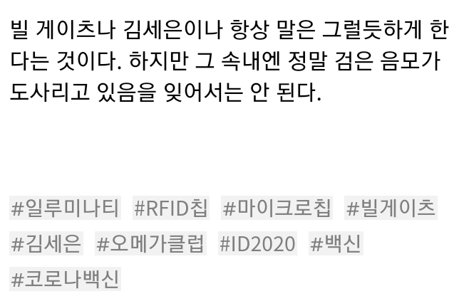 커튼뒤에사람들 책내용 코로나를 통해 악인들의 생체칩이 강제로 삽입될것이다라는 내용입니다 깨어나십시요! 작성자미순|작성시간20.09.04|조회수341 목록 댓글 0 글자크기 작게가 글자크기 크게가 . 다음검색 현재 게시글 추가 기능 열기 북마크 공유하기 신고 센터로 신고 댓글 댓글 0 댓글쓰기 답글쓰기 댓글 리스트