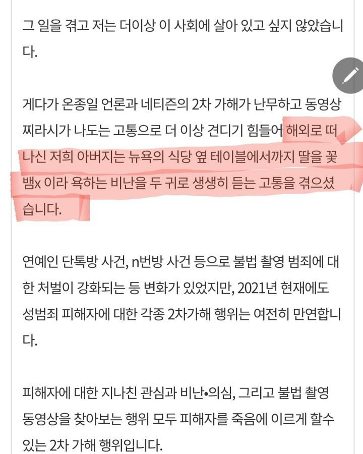 연예인 불법촬영 유포 사건의 피해자의 청원 글이다.