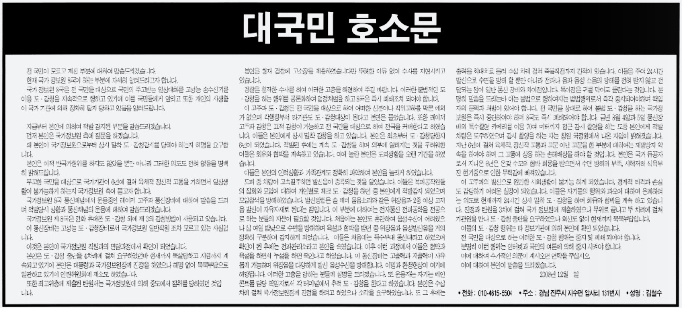 본인은 도·감청 중단을 4차례에 걸쳐 요구하였던바 현재까지 묵살당하고 지금까지 계속되고 있기에 본인은 대통령과 국가정보원장께 진정을 하였으나 해명 없이 묵묵부답으로 일관하고 있기에 인권위원회에 제소도 하였습니다.