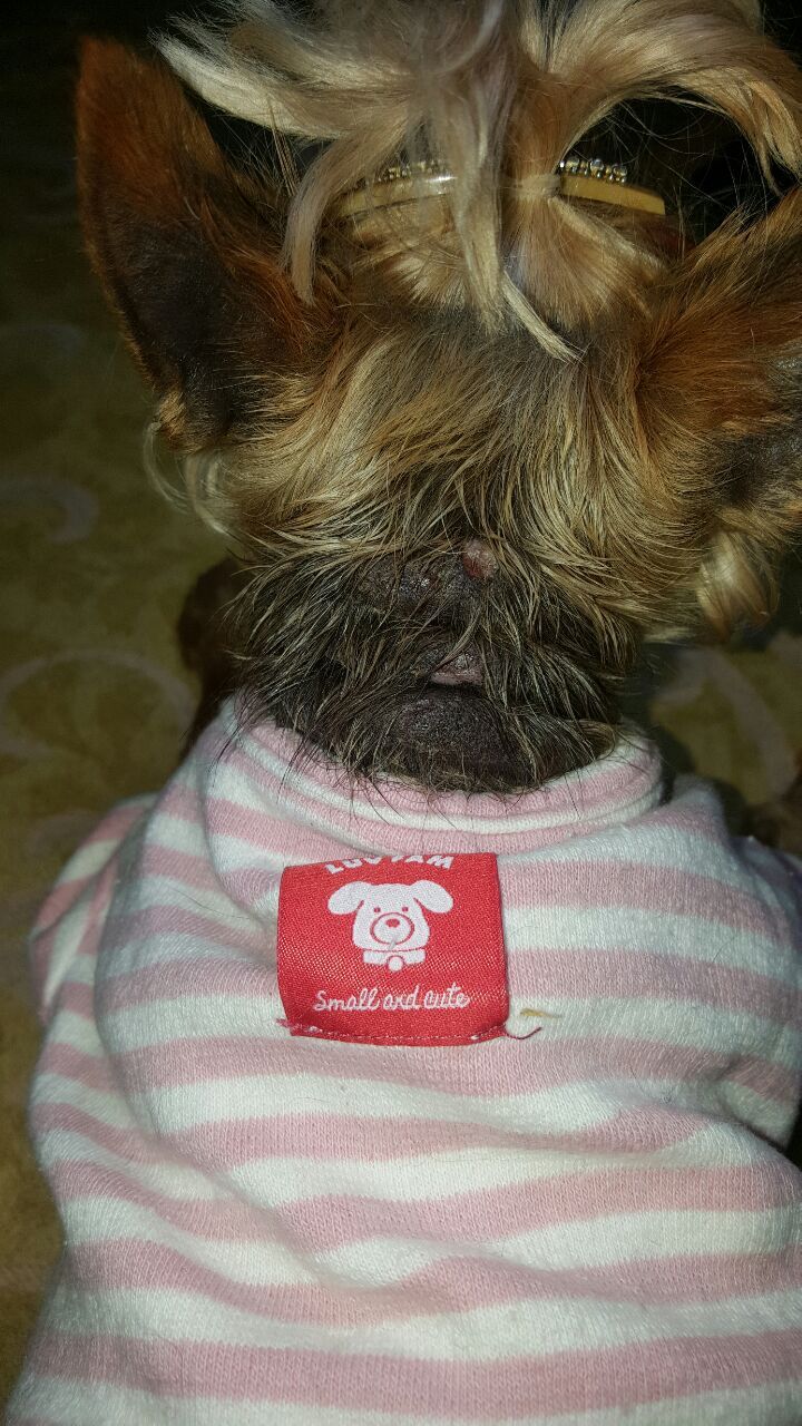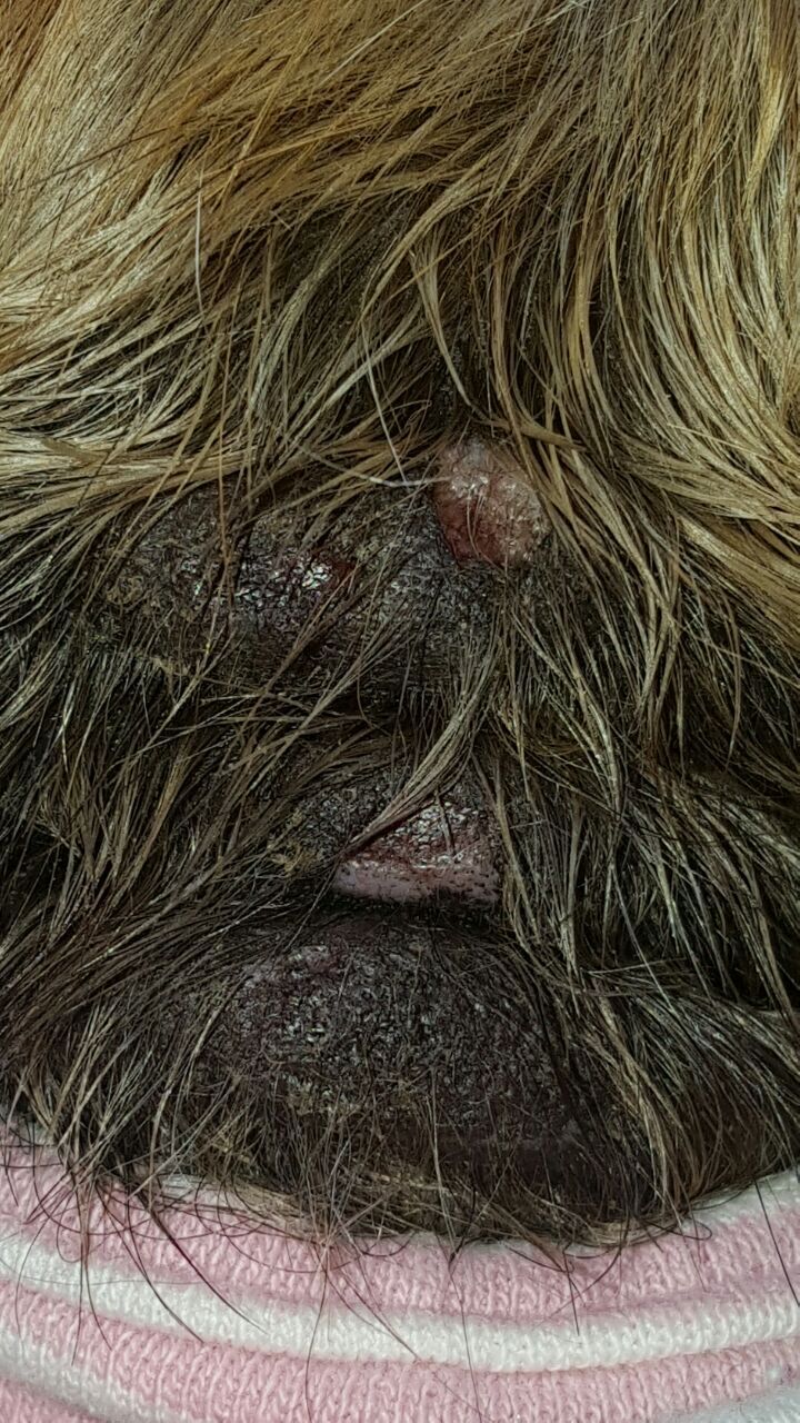 2.3일 사이에 목뒤에 이마주름처럼 볼록볼록 튀어 나오면서 검은딱지가 생기고 피부도 검고 약간 딱딱해진것도 같고 털까지 듬성하게 줄어들었네