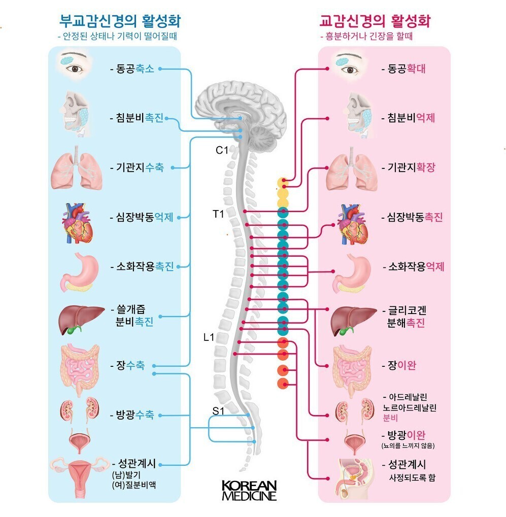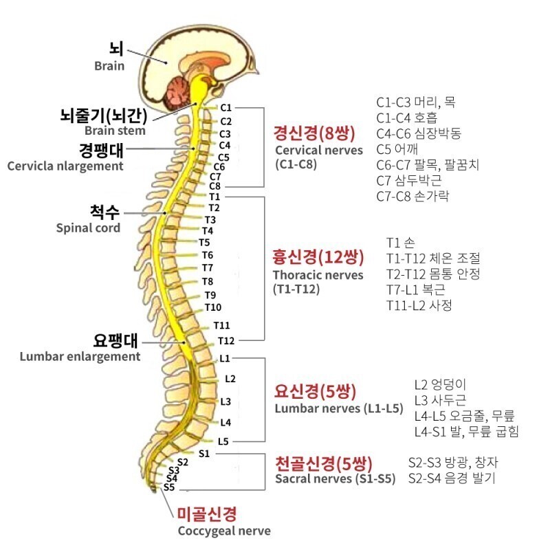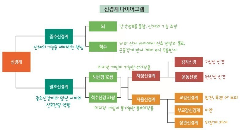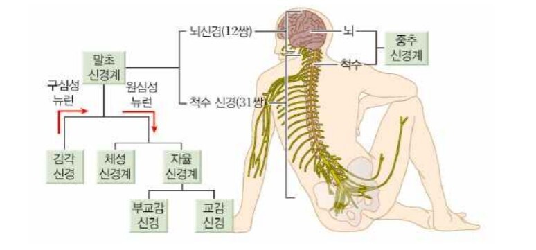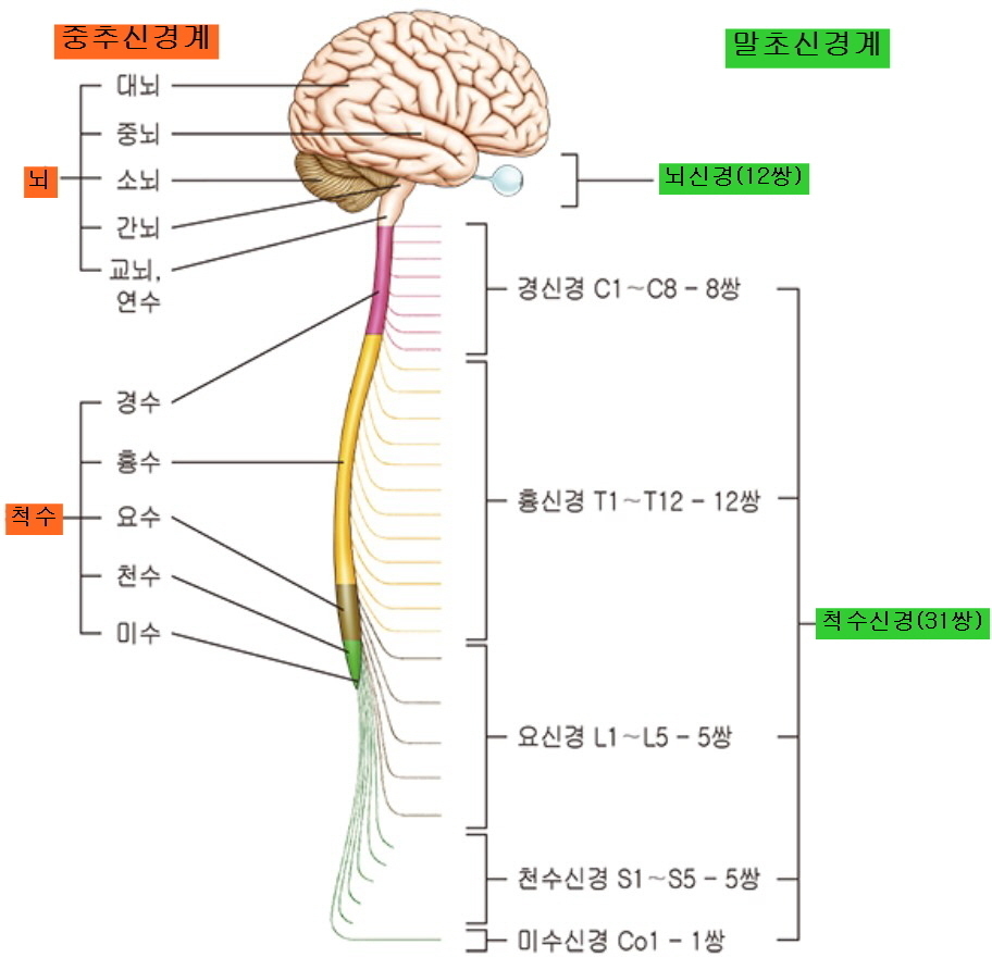 【신경계(중추신경계(뇌, 척수), 말초신경계(뇌신경 12쌍, 척수신경 31쌍)로 구분)】