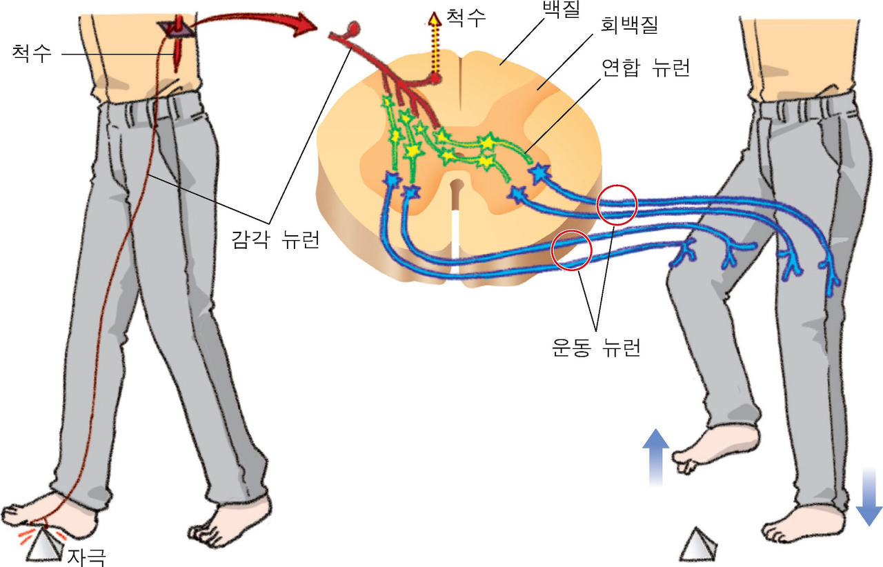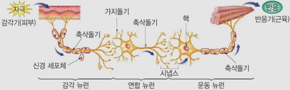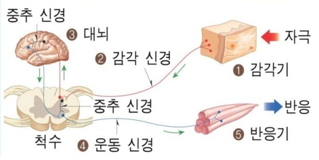 자극 ⟶ 감각기관 ⟶ 감각뉴런 ⟶ 연합뉴런 ⟶ 운동뉴런 ⟶ 반응기관 ⟶ 반응
