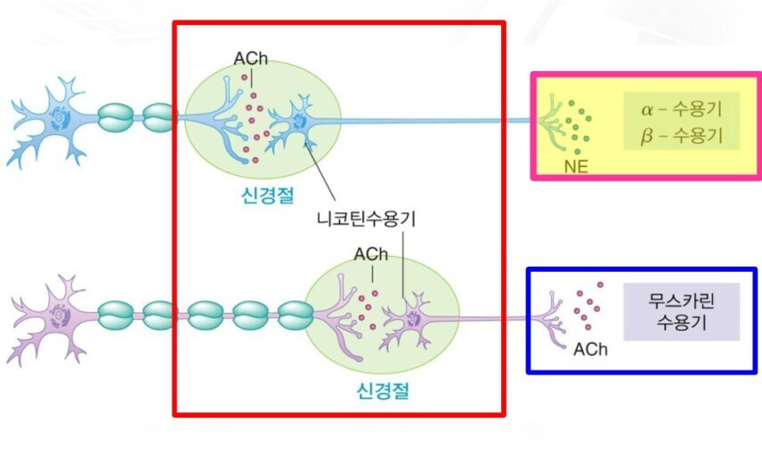 신경전달물질 ⟶ 도파민, 아드레날린 (노르아드레날린), 세로토닌 등